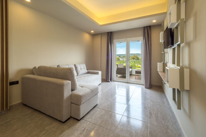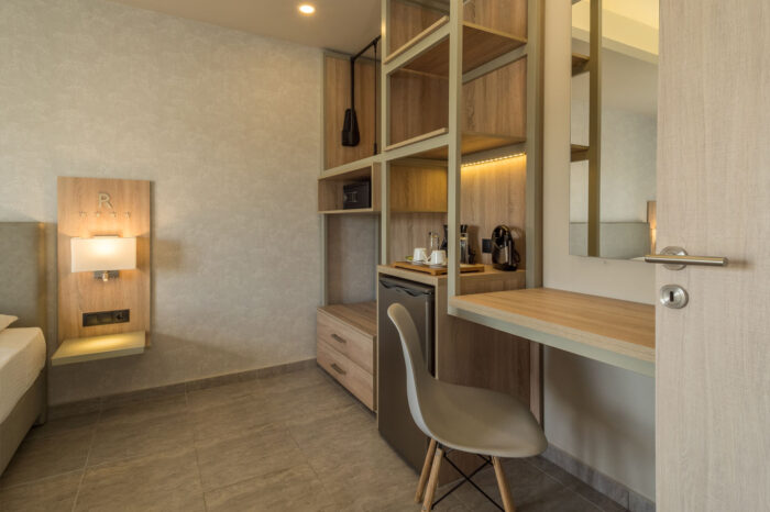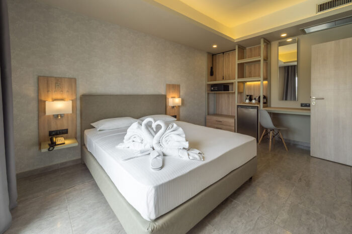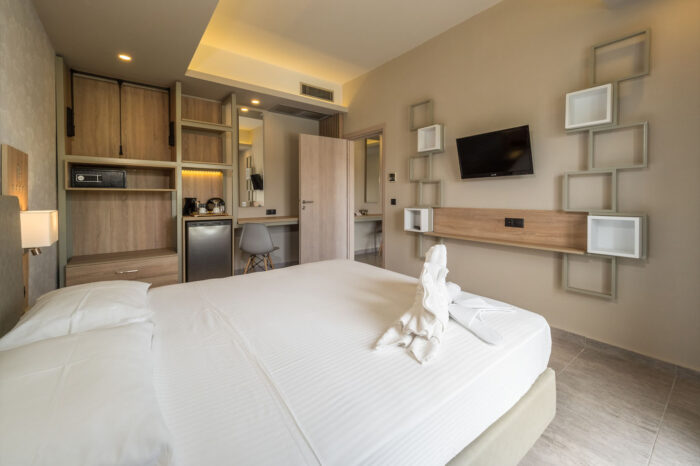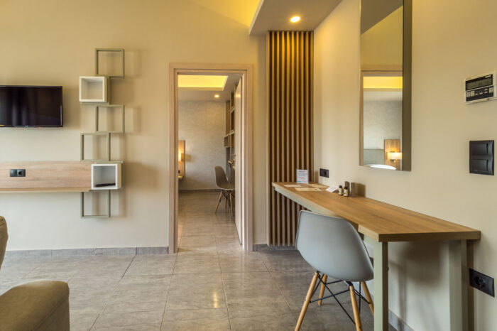 Το υπνοδωμάτιο περιλαμβάνει ένα διπλό κρεβάτι, τηλεόραση, κλιματιστικό και χρηματοκιβώτιο. Στο καθιστικό υπάρχει ένας καναπές που μετατρέπεται εύκολα σε διπλό κρεβάτι και μπορεί να φιλοξενήσει έως δύο ενήλικες. Το καθιστικό έχει και αυτό την δική του τηλεόραση, κλιματιστικό, mini ψυγείο, και ένα πλήθος άλλων παροχών που αναφέρονται παρακάτω. Στην δόμηση του χώρου προστίθεται ένα άνετο μπάνιο με καμπίνα ντουζ, ατομικά μπουρνούζια, ατομικές παντόφλες, σεσουάρ και πλήρης σετ ατομικής περιποίησης και φροντίδας. Η αρχιτεκτονική δομή του δωματίου, ολοκληρώνεται από το δικό του άνετο μπαλκόνι ή βεράντα, με έπιπλα εξωτερικού χώρου, για να απολαμβάνεται ιδιωτικά την κάθε σας στιγμή, με φόντο την καταπληκτική θέα της πισίνας και το μαγευτικό απέραντο γαλάζιο του Μεσσηνιακού κόλπου.