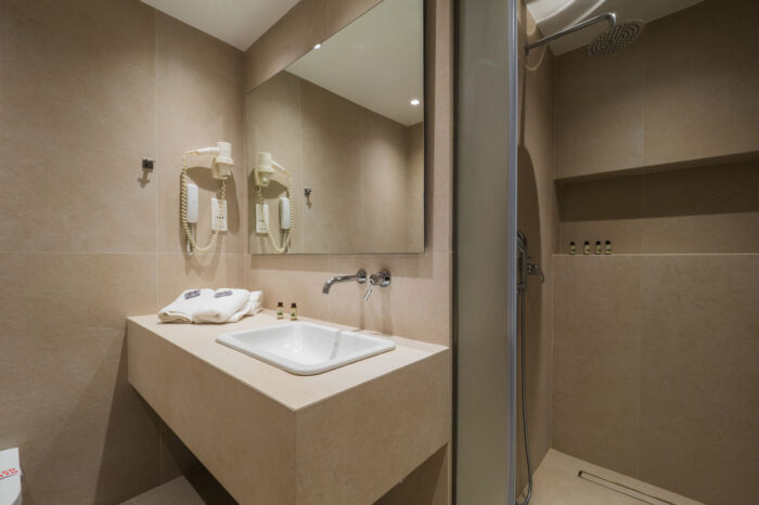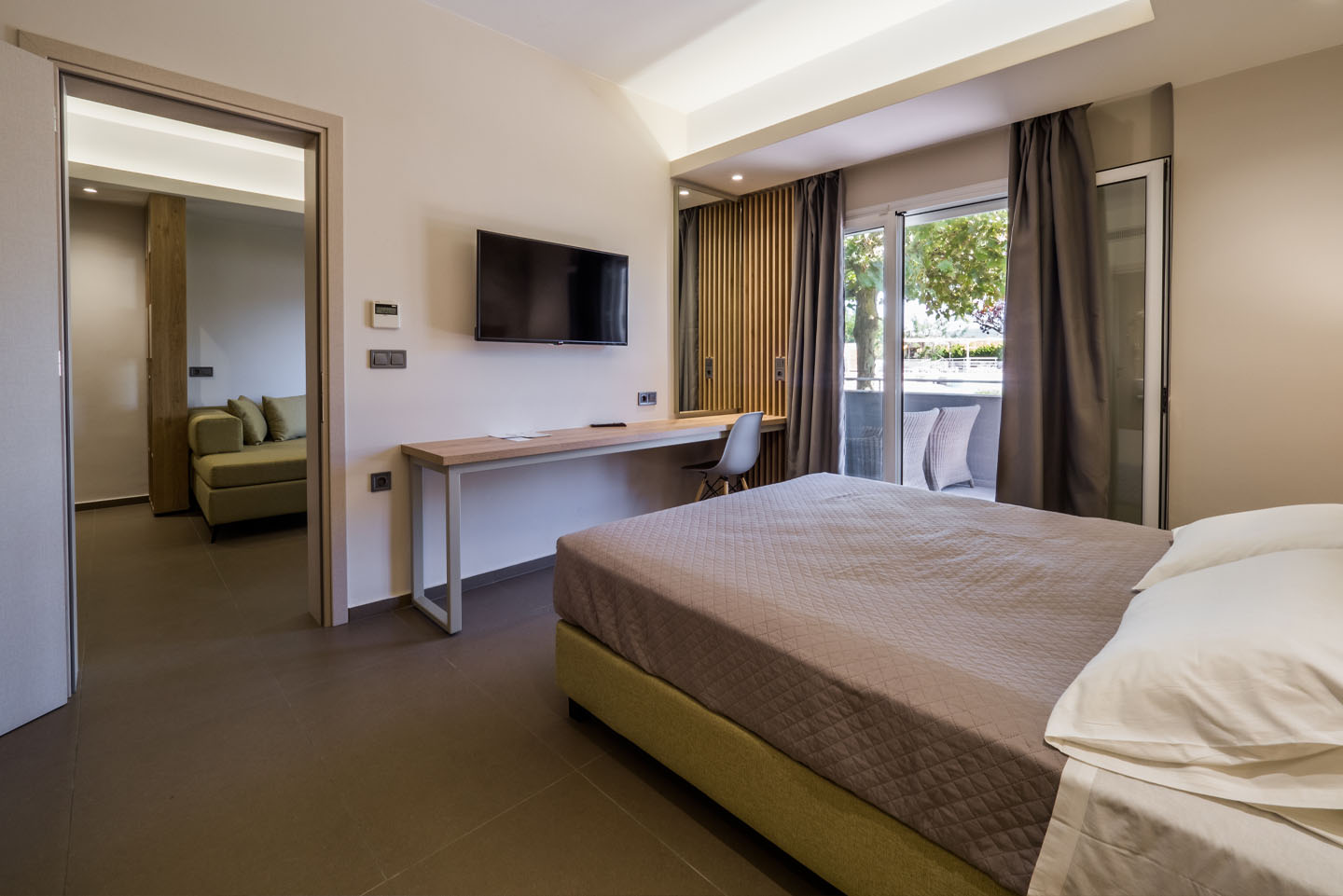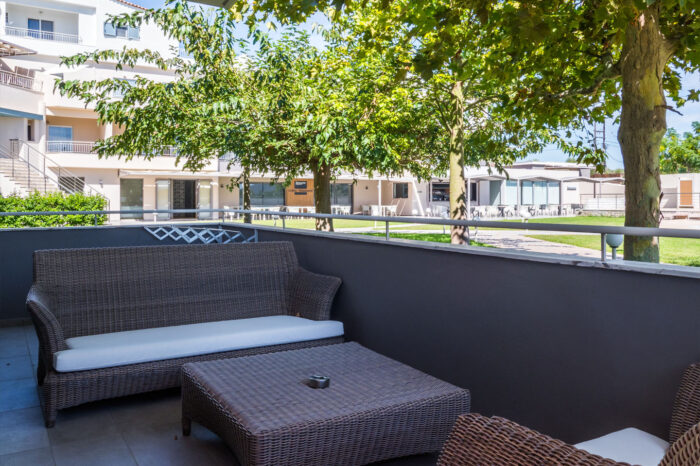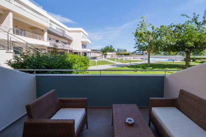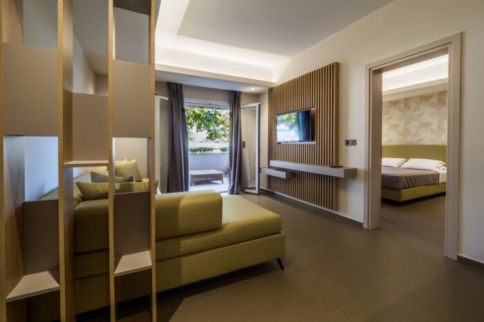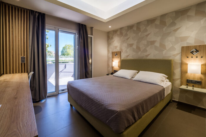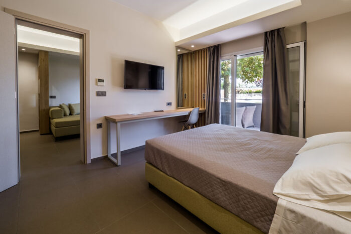 The architectural structure of the room is completed by its own comfortable balcony or terrace, with outdoor furniture, to ensure you enjoy every moment in private, with the amazing view of the swimming pool and the lush green garden of our hotel.