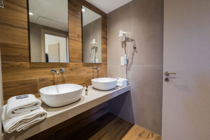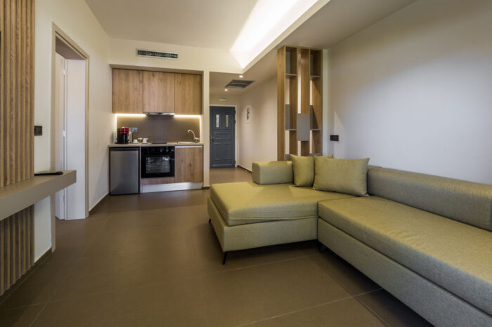 The bedroom includes a double bed, a TFT LED TV, an Air Condition and a safe deposit box. The living room includes a sofa that can easily be converted into a double bed and is capable of accommodating up to two adults. It also includes an electric kitchen with a complete dining set. The living room also comes with its own TFT LED TV, Air Condition, mini fridge and a variety of other amenities listed below. The suite also features two comfortable bathrooms which includes a shower cubicle, individual bathrobes, individual slippers, a hairdryer and a complete set of self-care products.